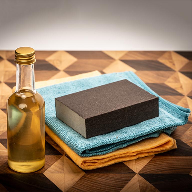 Hochwertiges, lebensmittelechtes Öl zur regelmäßigen Behandlung von Stirnholz. Es schützt vor Austrocknung, frischt die Farben auf und erhält die natürliche Maserung. - Schleif- bzw. Pflegepad